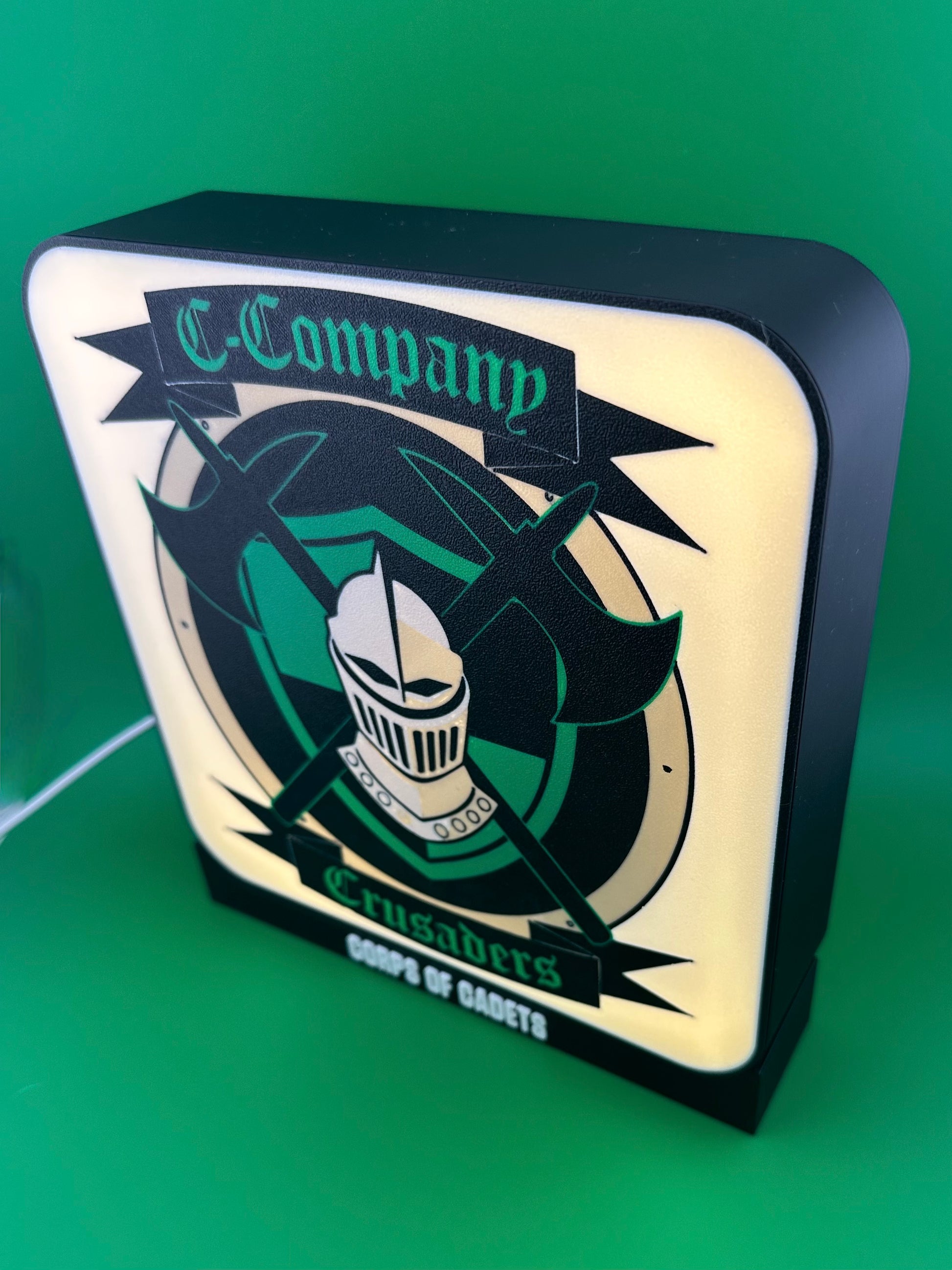 Bring the Spirit of Aggieland to life with a handcrafted Corps of Cadets backlit insignia glowbox. Designed with precision 3D printing and illuminated by adjustable LED lighting, these custom glowboxes showcase outfit pride in a bold and timeless way.
