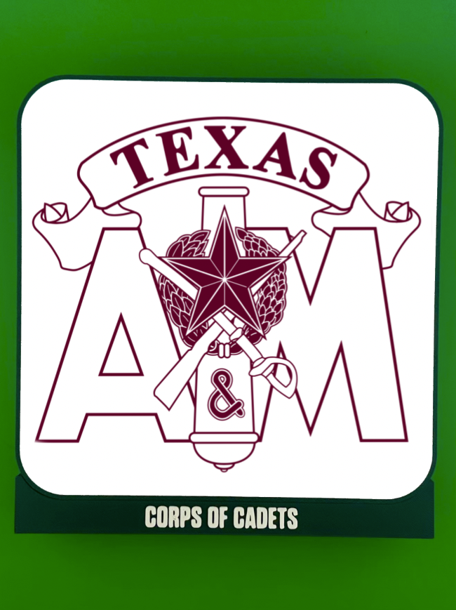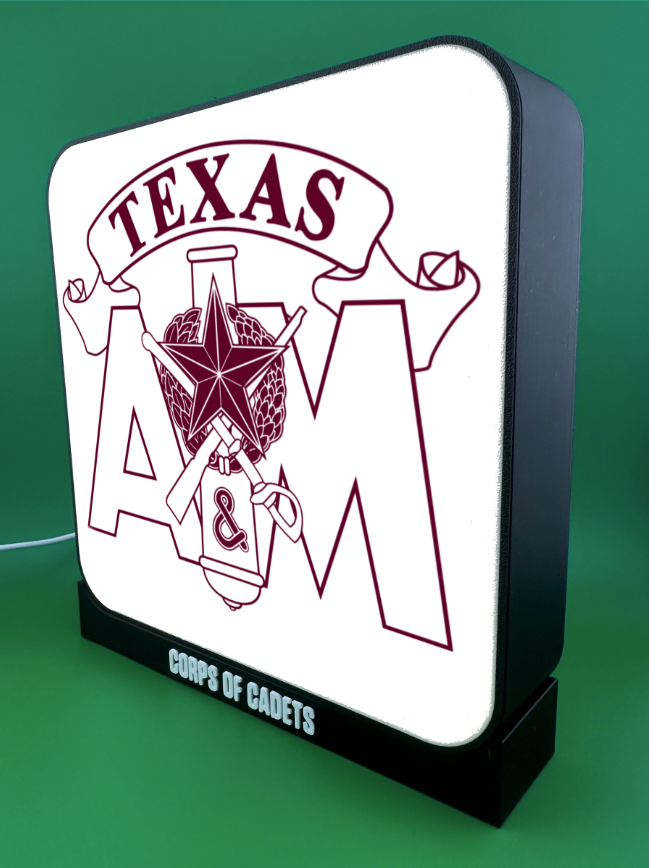 Bring the Spirit of Aggieland to life with a handcrafted Corps of Cadets backlit insignia glowbox. Designed with precision 3D printing and illuminated by adjustable LED lighting, these custom glowboxes showcase outfit pride in a bold and timeless way.