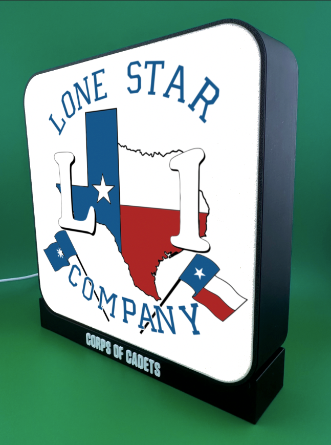 Bring the Spirit of Aggieland to life with a handcrafted Corps of Cadets backlit insignia glowbox. Designed with precision 3D printing and illuminated by adjustable LED lighting, these custom glowboxes showcase outfit pride in a bold and timeless way.