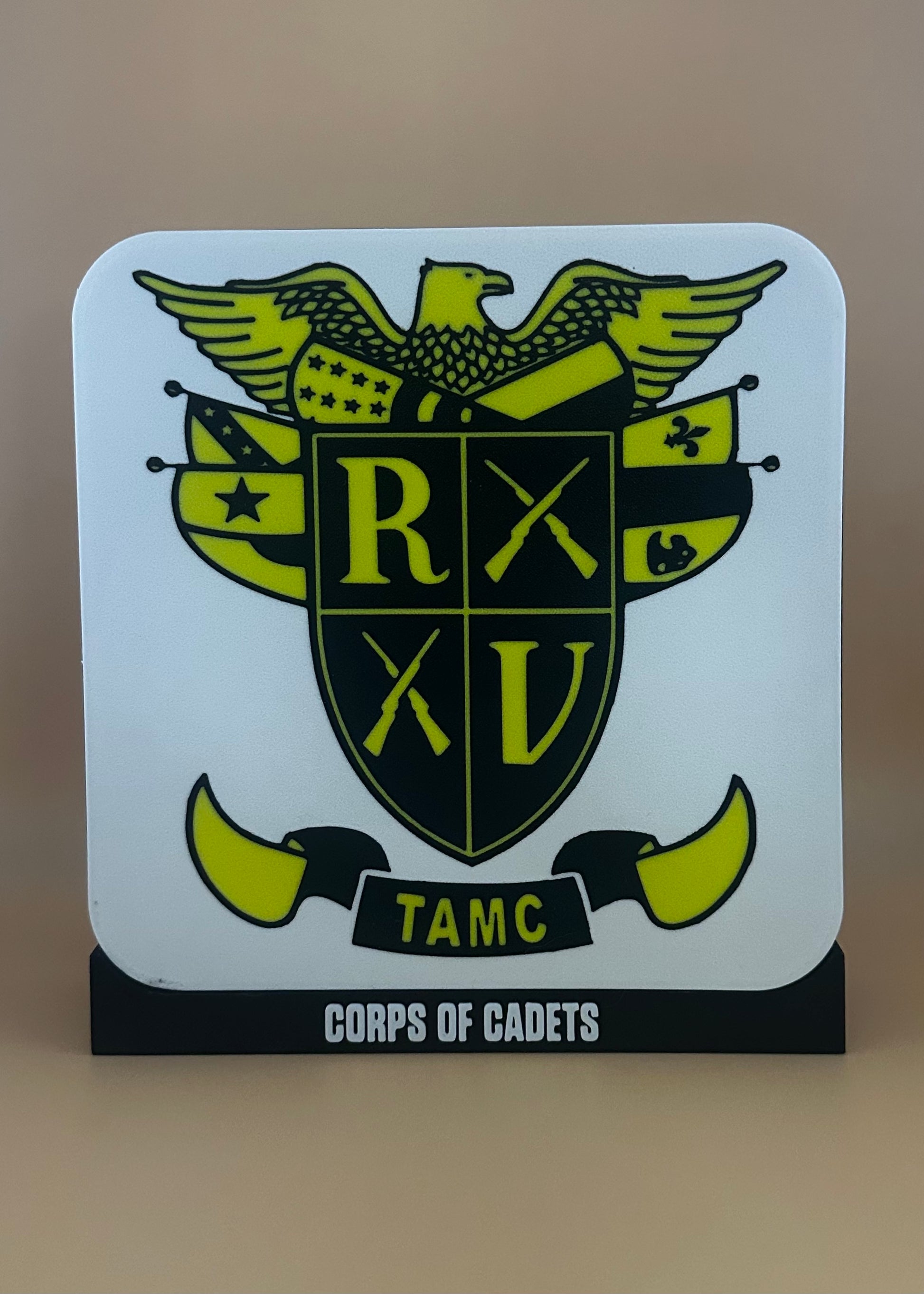 Bring the Spirit of Aggieland to life with a handcrafted Corps of Cadets backlit insignia glowbox. Designed with precision 3D printing and illuminated by adjustable LED lighting, these custom glowboxes showcase outfit pride in a bold and timeless way.